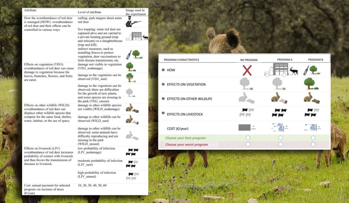 The data collection was based on conducting online surveys in which a choice experiment was included, so that the respondents (a total of 190 Spanish people) could express their preferences on population control measures related to the intensity of the negative effects of the overabundance of wild ungulates in these national parks. Such negative impacts included effects on vegetation, on other wild wildlife species, and disease transmission to livestock.