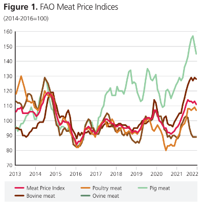 International meat prices rose amid tight global supplies from leading exporters.International meat prices, measured by the FAO Meat Price Index averaged 107.7 in 2021, up 12.2 points (12.7 percent) from 2020. In 2021, ovine, bovine, and poultry meat sub-indices registered sharp increases, while the pig meat sub-index remained largely unchanged.