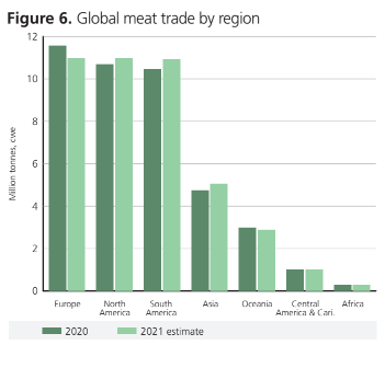 World total meat exports reached 42.1 million tonnes in 2021, up 0.9 percent from 2020, albeit slower than the average growth rate. The growth slowdown in 2021 reflects significant import curtailment in Asia and Europe, offset by increases in the Americas, Africa and Oceania.