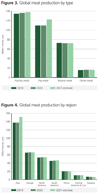 World total meat production reached 355.5 million tonnes (in carcass weight equivalent) in 2021, up 4.5 percent from 2020. Increased pig meat output underpinned the total meat production expansion, with poultry meat making the second-highest volume gain, followed by bovine and ovine meats.