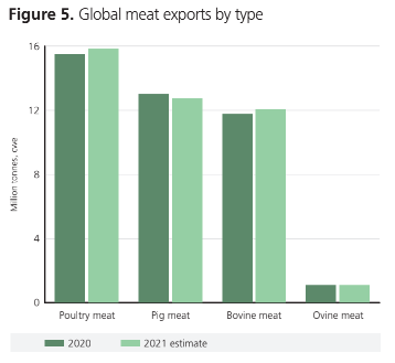 Tight supplies from leading exporting countries underpinned the 2021 international meat price increases. These tight supply conditions emerged due to the challenging production environment faced by many countries. Bovine meat supplies were exceptionally tight, reflecting the short supply of cattle for slaughter in South America due to lower cattle inventories, and in Oceania, amidst high herd rebuilding demand.