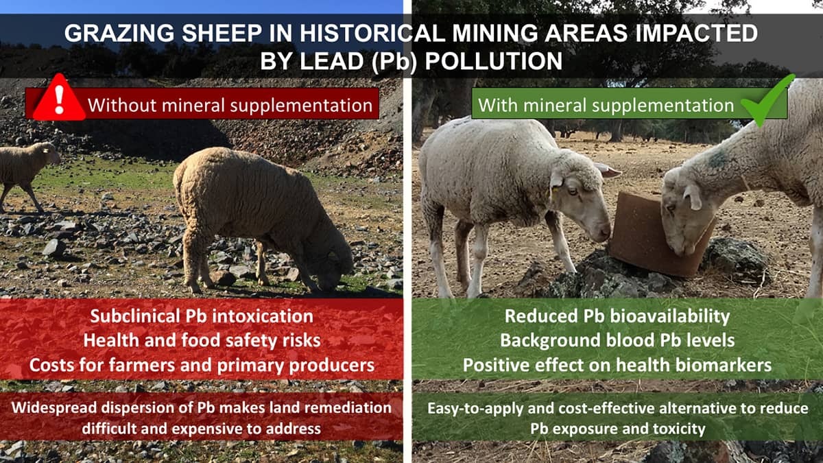 The results showed that the supplementation with a mineral block rich in phosphate and calcium carbonate is capable of significantly reducing oral exposure to Pb under real field conditions, especially in young sheep exposed to relatively high levels of soil contamination. In addition, mineral supplementation improved the antioxidant status of these sheep, increased its physiological capacity to counteract Pb toxicity.