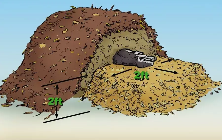 The base of a mortality compost pile is critical to composting success. The material must be carbon-based and act like a sponge that holds liquids that leave the carcass as it decomposes. The base should generously be 2 feet or deeper before a carcass is placed on the pile. Similarly, the carcass should receive 2 feet minimum of coverage. Signs of improper base construction or sparse coverage include visible liquids leaching from the pile (the 'sponge' was not big enough) or the presence of flies or birds and other scavengers attracted to exposed carcasses or wet spots. Odors are also indicative of improper base or coverage.