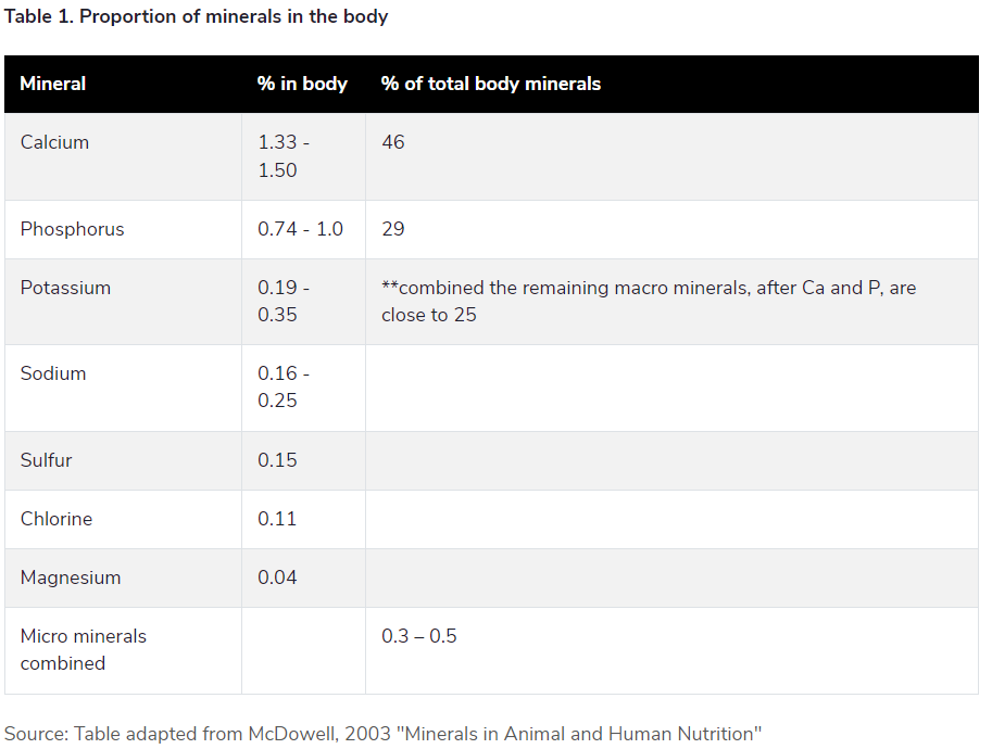 For example, macro minerals, like calcium (Ca) and phosphorus (P), are critical for bone growth and muscle contractions. Meanwhile, sodium (Na) and potassium (K) are important for what we call osmotic balance, making sure the body, which is largely water, stays hydrated so that it can function.