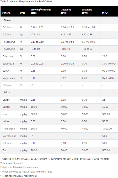Due to the critical functions of minerals in a number of body systems, there are specific mineral requirements for cattle. These requirements are often partitioned by class of cattle: growing, gestating, or lactating (Table 2). In addition, because minerals make up such a small proportion of the body and the diet, there are maximum tolerable concentrations (also in Table 2), or concentrations that if we exceed, cause toxicity problems and may risk doing more harm than good for the animal.