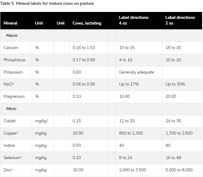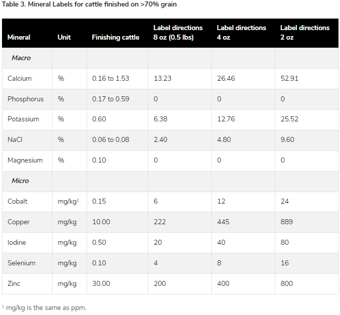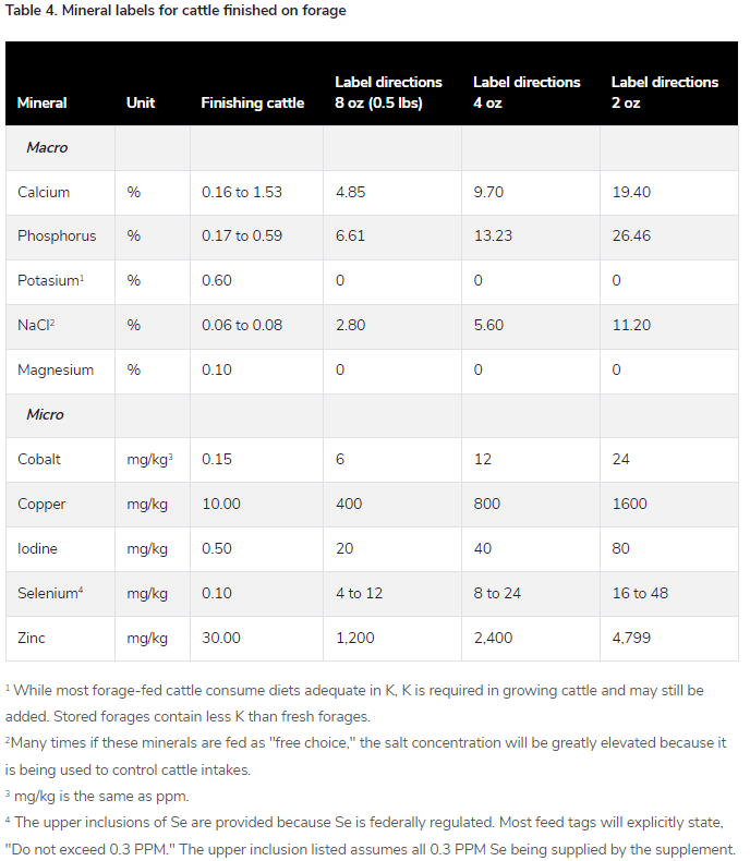 The challenge with considering possible mineral labels for forage-fed cattle is not knowing the soil or forage composition to determine the supply of minerals from the diet of the cattle. For example, one can calculate needs based on book values for Orchard grass hay, but this is a very dangerous assumption. Therefore, what far more mineral supplementation programs rely on is meeting the needs of the animals without knowing what will be supplied by the diet. Table 4 then presents possible mineral tags that may be generally formulated for growing and finishing cattle.