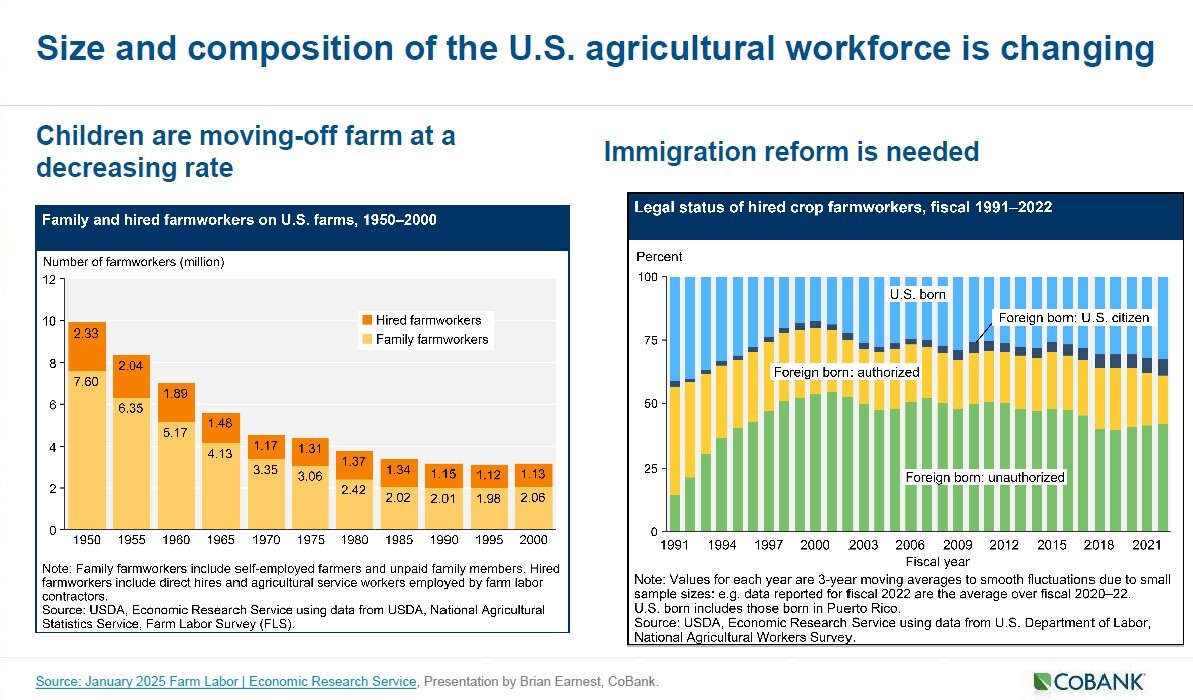 In the 1950s, about three-quarters of farm labor came from family members. Today, Earnest said, that share has dropped to roughly one-third, forcing farms to depend on non-family and often foreign workers.