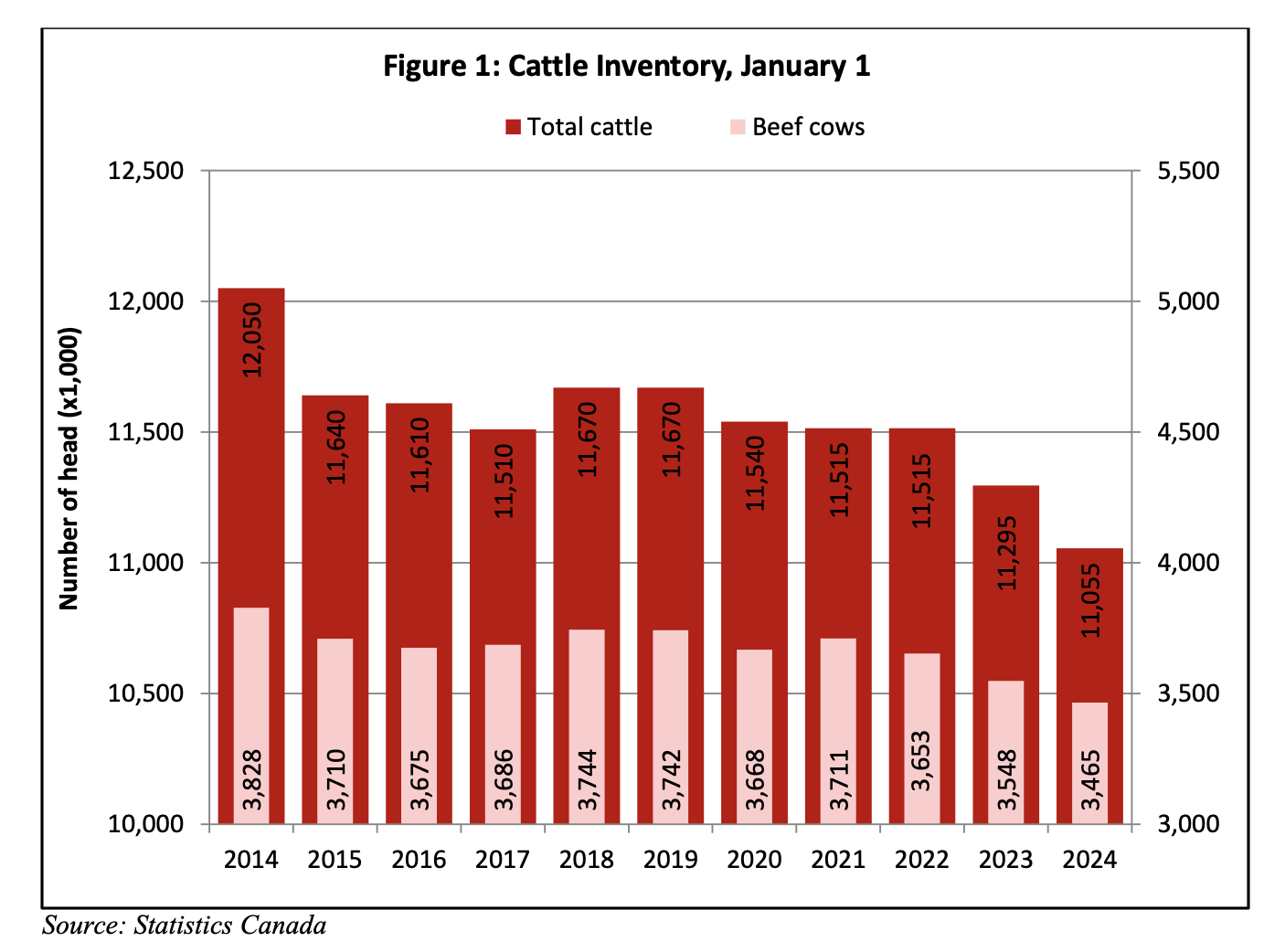 Statistics Canada’s January 1, 2024 herd inventory numbers showed beginning stocks down 240,000 head compared to January 1, 2023.