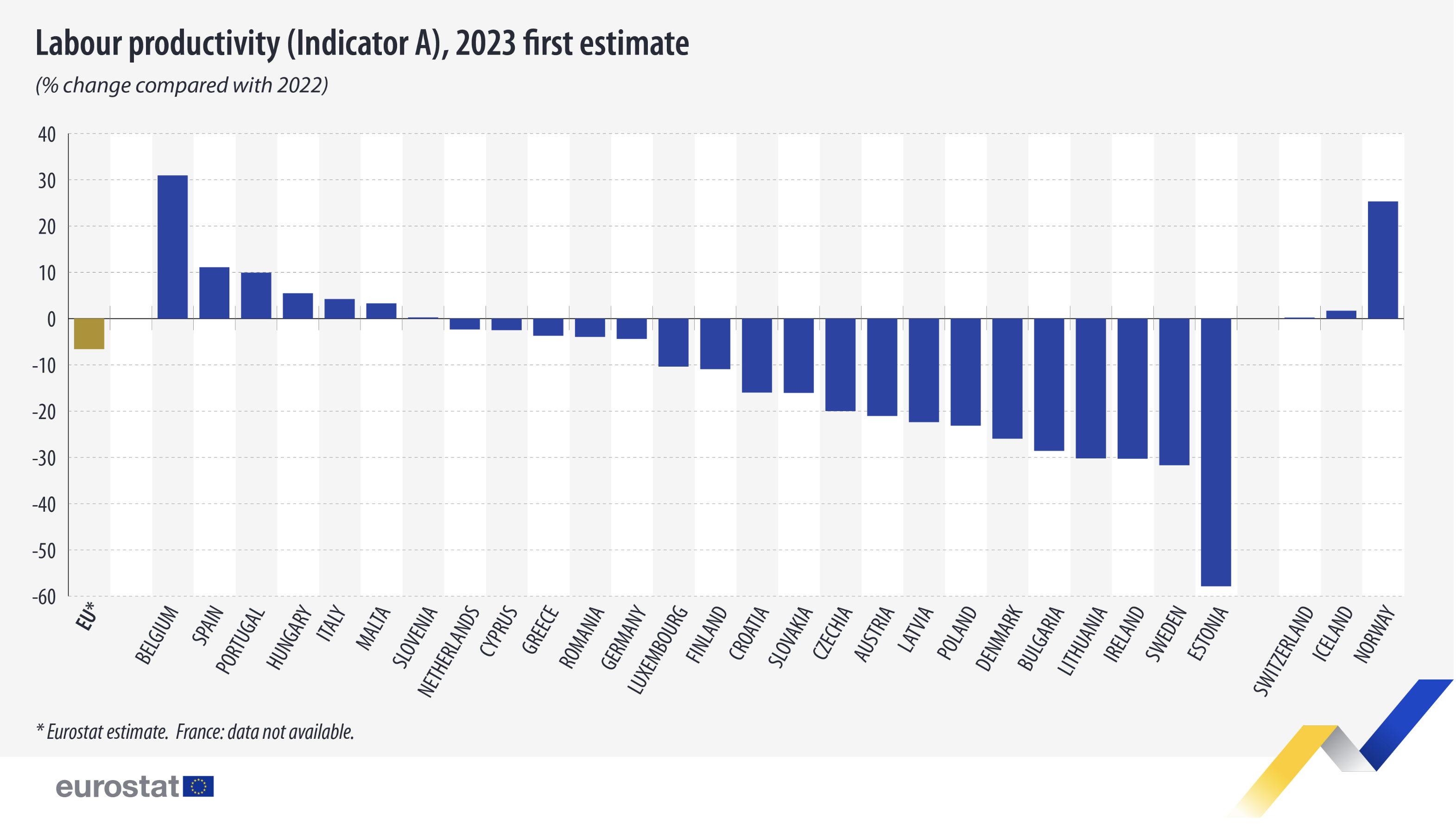 Belgium's productivity up 31%According to the first preliminary data for 2023 from the economic accounts for agriculture (EAA), the index of agricultural labour productivity in the EU is estimated to have decreased year-on-year by 6.6%, after growth between 2019 and 2022, according to a recent Eurostat report.