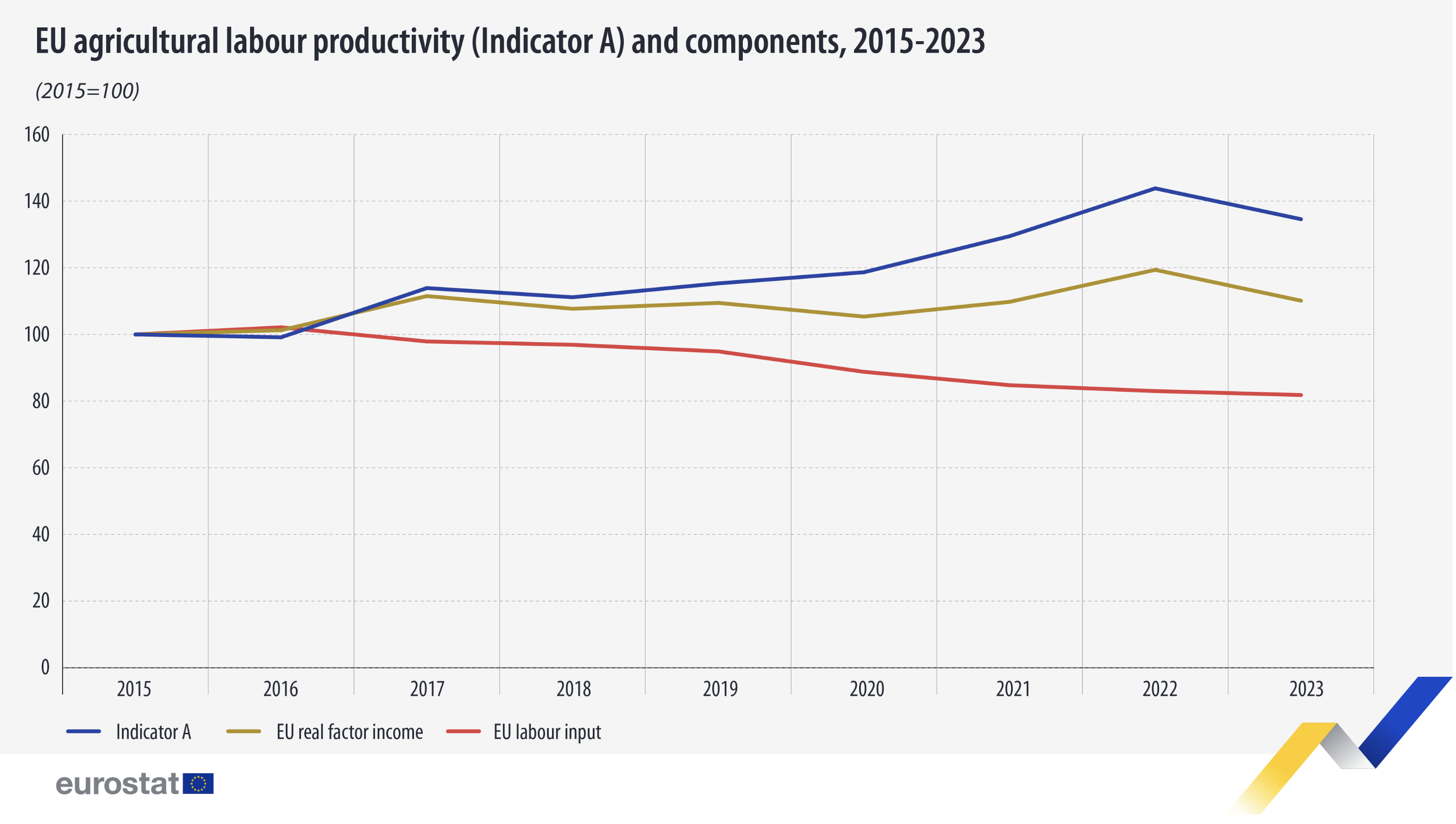 EU agricultural labour productivity 35% higher in 2023 than in 2015