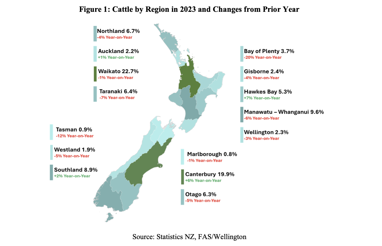 Low farm gate prices cited as one causeThe US Department of Agriculture's Foreign Agricultural Service post in Wellington, New Zealand forecasts cattle numbers to begin the 2025 Market Year (MY) at 9.56 million head, ending at 9.41 million, according to a recent USDA Global Agricultural Information Network (GAIN) report.