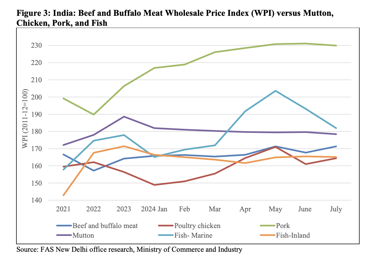 Beef prices lower than pork, mutton and chickenThe 2024 domestic wholesale price of beef and carabeef in India continues to rise, yet remains lower than pork, mutton, and fish, according to a recent US Department of Agriculture (USDA) Global Agricultural Information Network (GAIN) report.